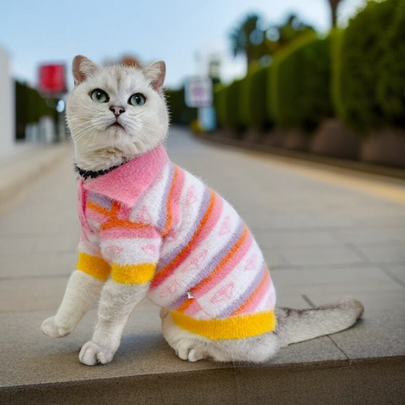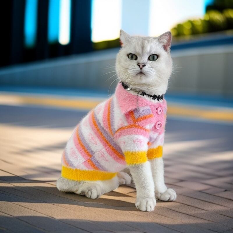 ピンク、オレンジ、イエローなどの明るい色を組み合わせた、パステルカラーのボーダー柄が楽しいニットポロシャツです。 ふわふわとしたモヘア風の柔らかな素材で、寒い季節も暖かく快適な着心地を提供します。 ボタンと襟付きのデザインが上品でレトロな可愛さを演出し、お散歩やお出かけが楽しくなる一枚です。
