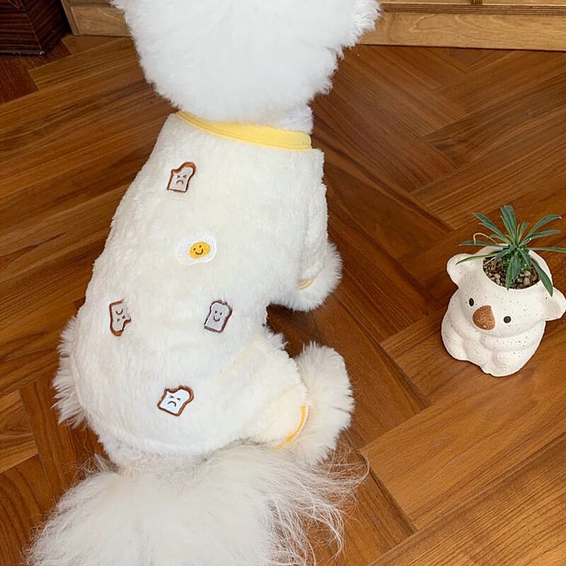 ○食パンや目玉焼きのユニークな刺繍が可愛い。あったか素材のウェアです。